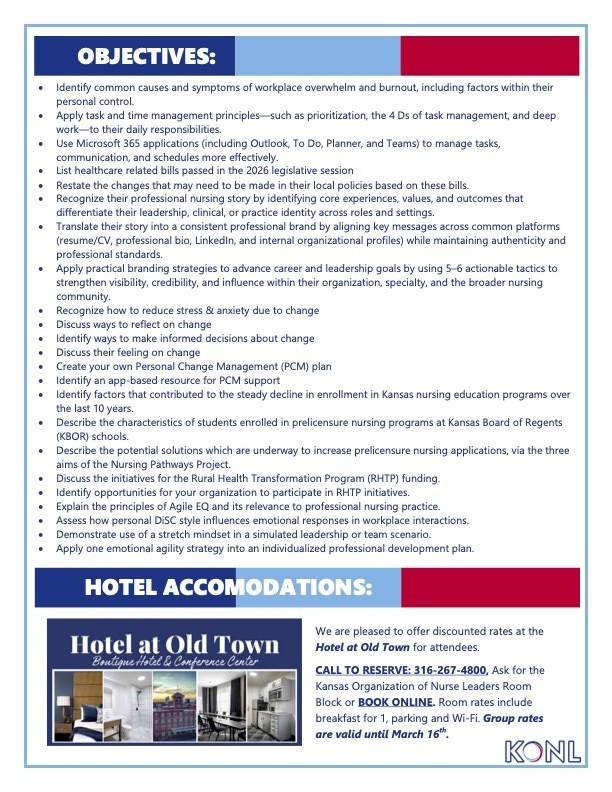 CALL TO RESERVE: 316-267-4800, Ask for the Kansas Organization of Nurse Leaders Room Block or BOOK ONLINE. Room rates include breakfast for 1, parking and Wi-Fi. Group rates are valid until March 16th.